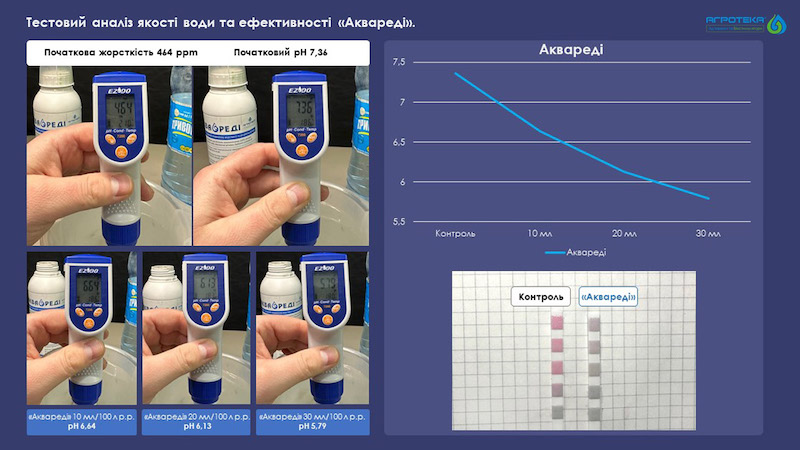 «Буває так, що під час підготовки робочого розчину випадає осад, утворюються якісь «незаплановані» сполуки, а ід час обробки посівів результат набагато гірший від очікувань. Насправді проблема просто у воді. Тобто у рівні її кислотності та жорсткості. Навіть ті, хто розумів важливість рівня рН води і якось його регулював, не завжди досягав потрібного ефекту. Оскільки, як показують дослідження, треба працювати з жорсткістю значно більше, ніж з кислотністю. Саме тому такі «народні» підкислювачі, як лимонна кислота чи сульфат магнію, дають нетривалий та недостатній ефект», — зауважує Юрій Третяк, генеральний директор компанії «Агротека».