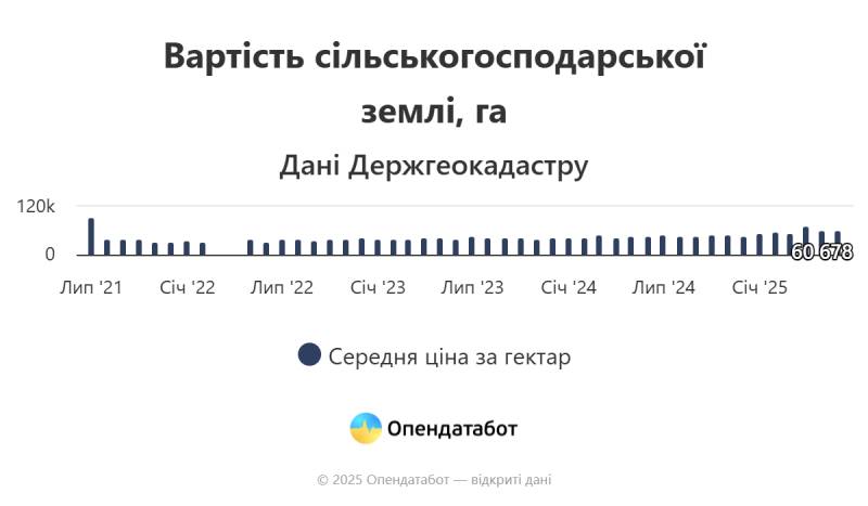 Про це повідомляє Опендатабот. Зазначається, що 339 644 угоди купівлі-продажу землі було укладено з моменту відкриття земельного ринку в Україні у липні 2021 року. Загалом продали понад 636 тис. га на 30,4 млрд грн. При цьому середня вартість одного гектара зросла на 60% — до 60,7 тисячі грн за гектар станом на червень 2025 року.