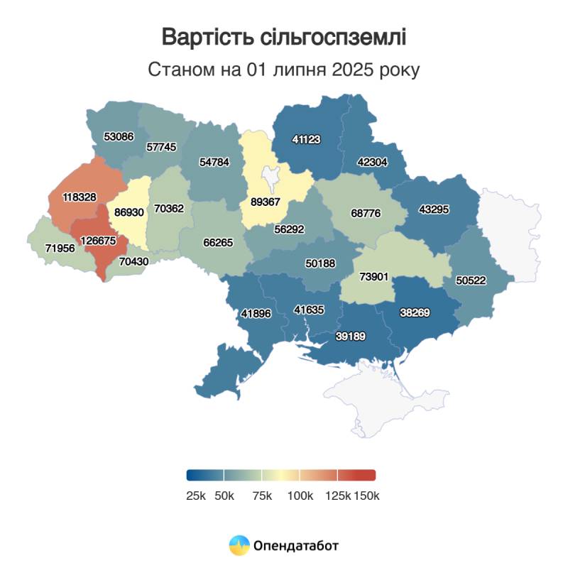 Найнижчі ціни на землю у прифронтових регіонах: Запорізька область — 38,3 тис. грн/га, Херсонщина — 39,1 тис. грн/га, Чернігівщина — 41,1 тис. грн/га, Миколаївщина — 41,6 тис. грн/га та Одещина — 41,8 тис. грн/га.