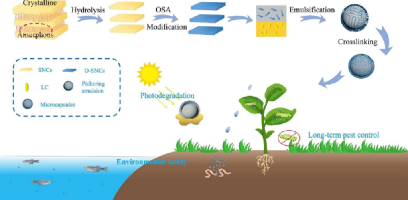 У цьому дослідженні науковці створили біорозкладні нанокристали крохмалю (SNC) шляхом кислотного гідролізу та використали SNC, модифіковані октенілбурштиновим ангідридом (O-SNC), для виготовлення мікрокапсул пестицидів. Зокрема, O-SNC використовувалися для емульгування розплавленого лямбда-цигалотрину (LC), за допомогою міжфазної полімеризації Пікерінга. Подальша міжфазна полімеризація цієї емульсії дала мікрокапсули, розмір яких можна регулювати, змінюючи вміст O-SNC.