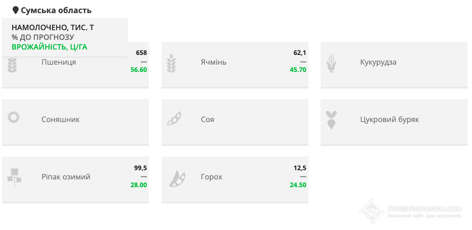 У Сумській області триває активне збирання ранніх зернових і зернобобових культур. Станом на початок серпня обмолочено 144,6 тис. га, що становить 76% від запланованих площ. Намолочено 764,2 тис. тонн зерна за середньої урожайності 52,8 ц/га, що на 3,4 ц/га перевищує минулорічний показник.