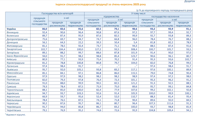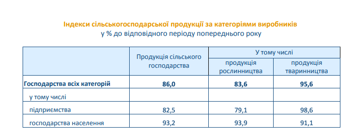 Зокрема, виробництво продукції рослинництва скоротилось на 16,4%, а тваринництва — на 4,4%. Агропідприємства скоротили виробництво на 17,5%, тоді як господарства населення — на 6,8%.