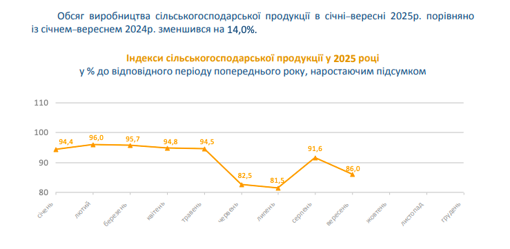 Виробництво агропродукції в Україні скоротилося на 14% за січень–вересень 2025 року