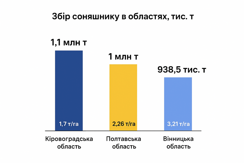 Найбільший валовий збір соняшнику в Кіровоградській області — 1,1 млн т соняшнику при врожайності 1,7 т/га. В Полтавській області зібрали 1 млн т соняшнику з врожайністю 2,26 т/га. Вінницька область намолотила 938,5 тис. т при врожайності 3,21 т/га.