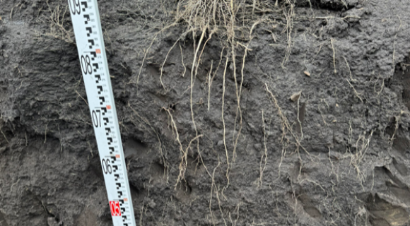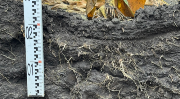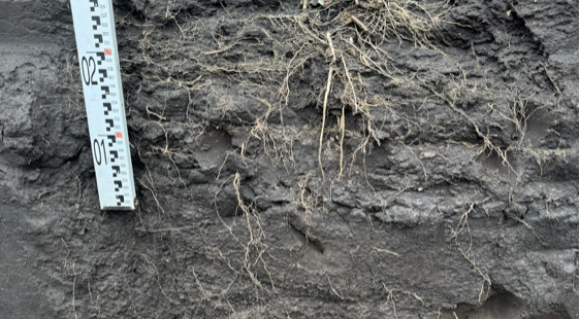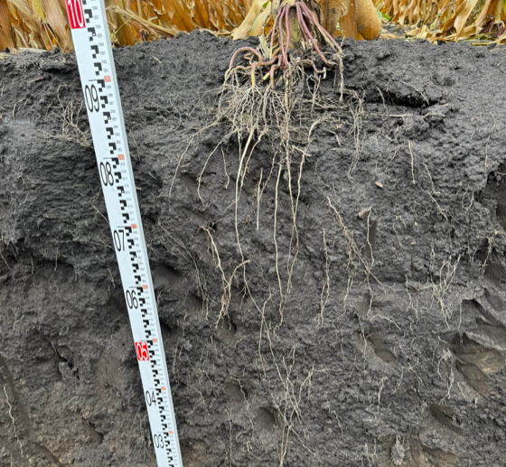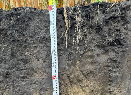На момент дослідження шурфа ґрунт залишався добре розпушеним і легко піддавався лопаті. Навесні була сформована стрічка, що створює оптимальні умови для розвитку кореневої системи, вона була помітна і на момент дослідження. Основна особливість strip-till полягає у концентрації розвитку коренів саме в зоні розпушення ґрунту. Структура ґрунту збережена, ущільнення на полі відсутнє. Максимальний розвиток кореневої системи спостерігається на глибину 25–30 см, а пучок коренів у зоні внесення добрив — близько 20 см. Частина коренів проростає нижче 110 см, і це не поодинокі корінці; нижній шар ґрунту структурований і без ущільнення.