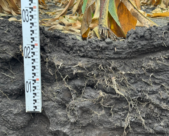 Оранка проводилася з урахуванням гумусованого горизонту. «Перше, на що хочу звернути увагу, — це потужність гумусованого горизонту. Тут у нас 80 сантиметрів, які потрібно використати на повну для отримання високих врожаїв. Для цього важливо, щоб коренева система проникала на весь профіль», — зазначив фахівець. Основна маса коренів зосереджена у шарі 5–30 см, окремі корінці досягли 100 см, що пояснюється високою якістю живлення та застосуванням техніки BEDNAR.