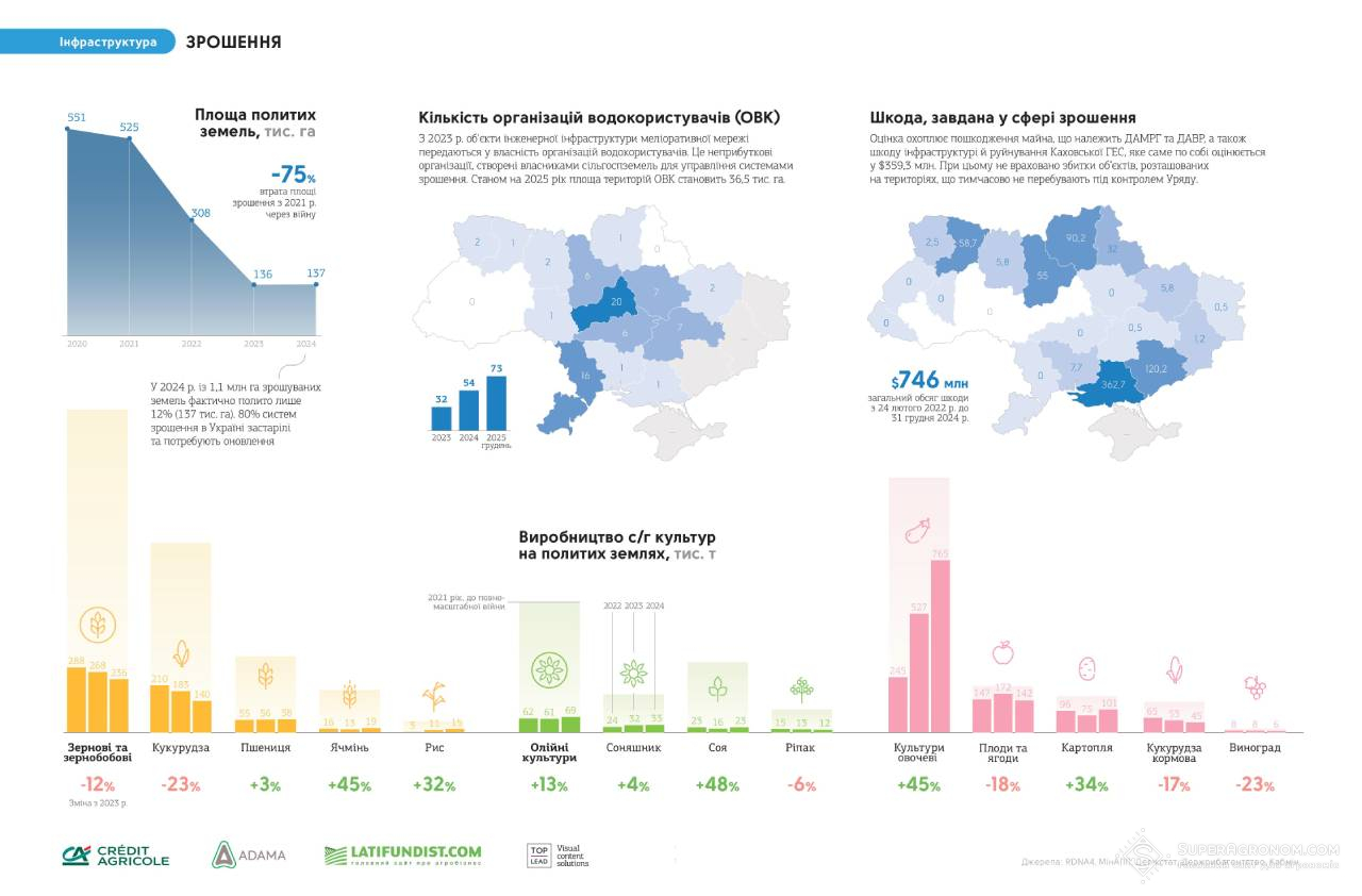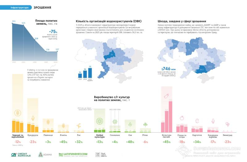 Зокрема, зазначено, що з 2021 року площа политих земель через війну скоротилась на 75% (2021 р. — 525 тис. га, 2024 р. — 137 тис. га).