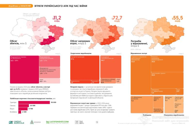 Український агропромисловий комплекс зазнав масштабних втрат унаслідок повномасштабної війни. Станом на кінець 2024 року загальні прямі та непрямі втрати агросектору оцінюються майже у $84 млрд, а потреби у відновленні — у $55,5 млрд.