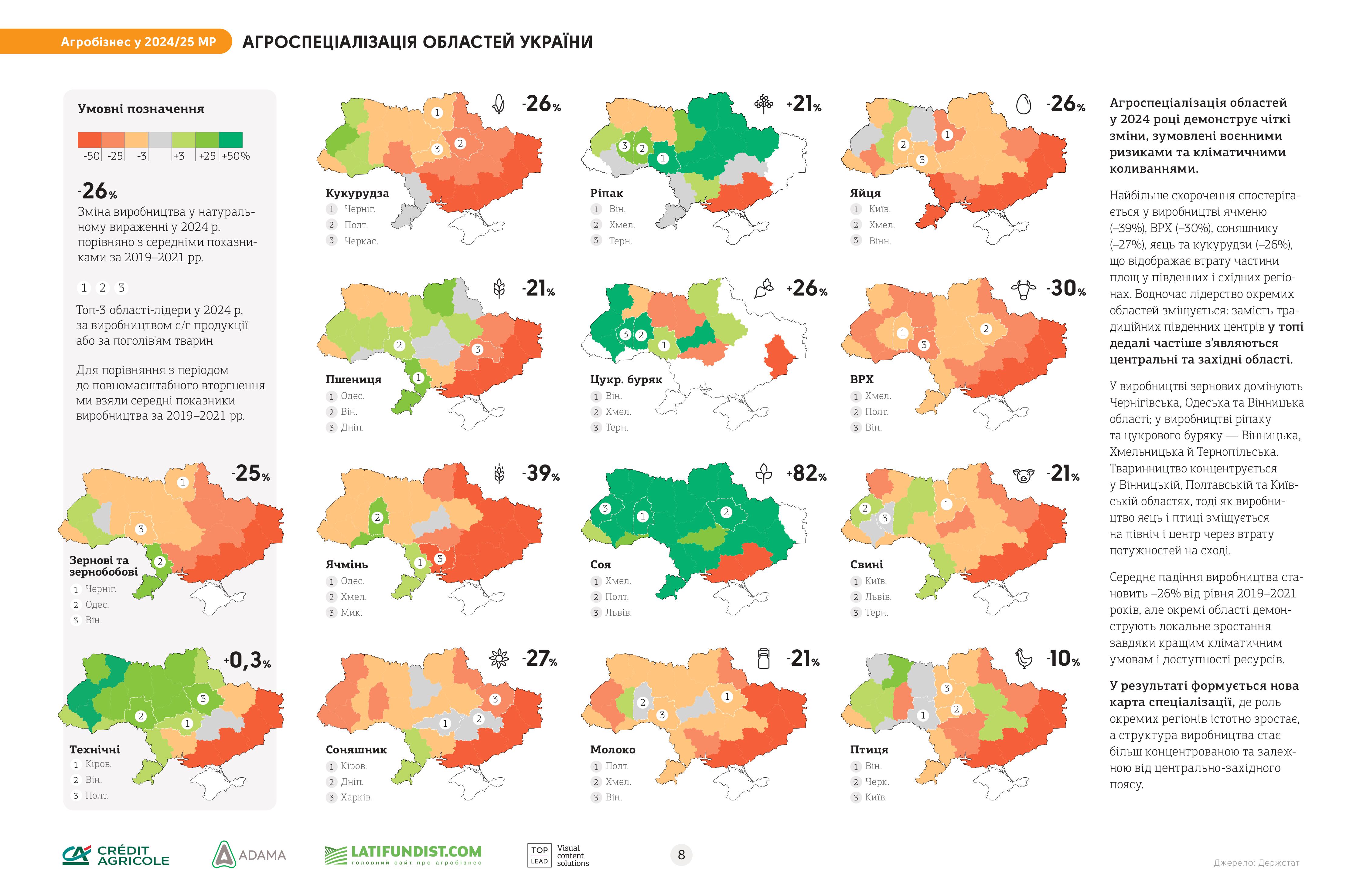 За даними дослідження, географія виробництва суттєво змінилася. Якщо до 2022 року аграрне лідерство зосереджувалося переважно на півдні, то нині центральні та західні області — Хмельницька, Вінницька, Тернопільська, Полтавська — формують новий центр аграрної активності.