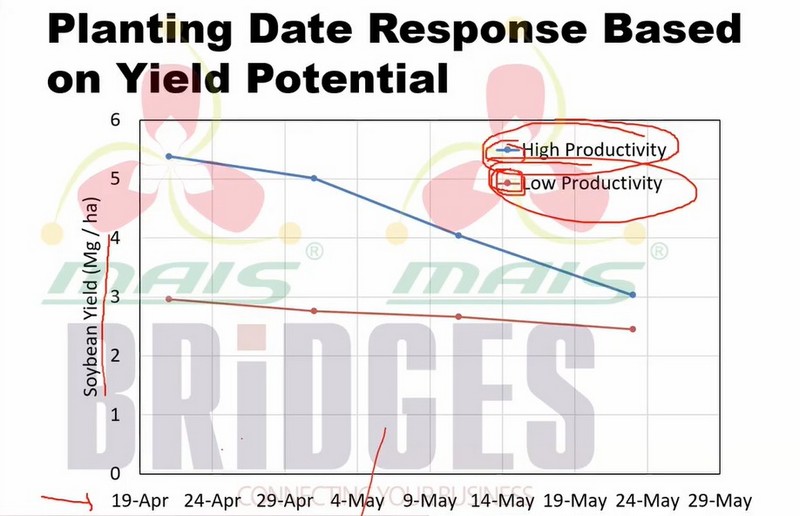 Це можна побачити на графіку, який ілюструє, що висів сої у період з 19 по 24 квітня на низькопродуктивному полі забезпечує урожайність 3 т/га, а при сівбі з 29 квітня по 4 травня 2,8 т/га. При цьому висів другій декаді травня не надто змінює ситуацію. На противагу, на високопродуктивних полях з'являється шанс отримати понад 5,4 т/га сої при висіві у період з 19 по 24 квітня. Вже в період з 29 квітня по 4 травня врожайність знижується до 5 т/га. За більш пізніх термінів (24 травня) — до 3 т/га.