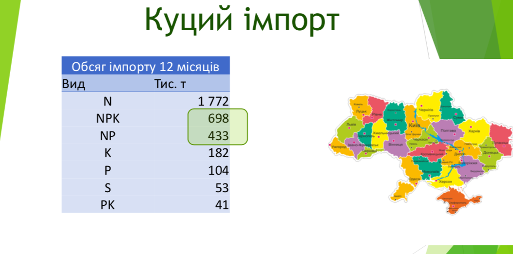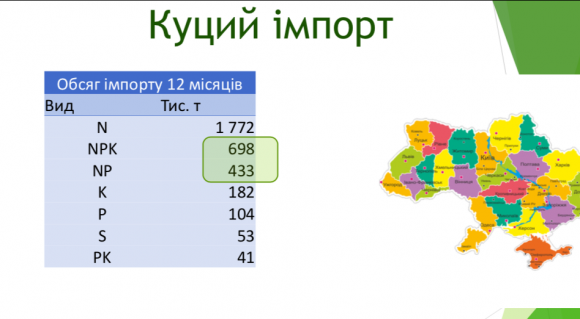 «Ми маємо зараз досить куций імпорт по NPK та NP-добривах. При тому, що раніше ми завозили 2 млн т NPK, зараз не завозимо навіть 700 000 т. А по NP ситуація ще гірша. Раніше завозили до 1 млн, 900 000 т, зараз — 433 000 NP. І переважно це сульфоаммофос.
