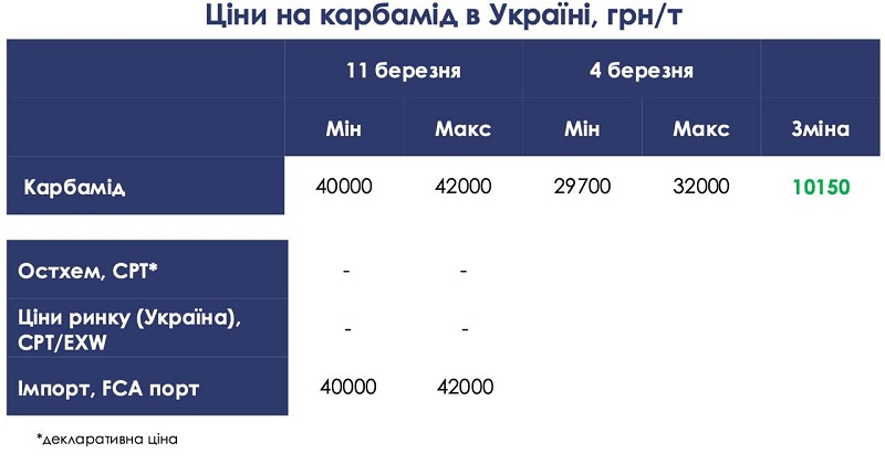 Ціни на карбамід в Україні продовжують рости. Станом на 11 березня імпортний карбамід на умовах FCA порт подорожчав до 40–42 тис. грн/т, що приблизно на 10,1 тис. грн/т більше, ніж тижнем раніше. Про це пише Latifundist.com з посиланням на інформацію Barva Invest.