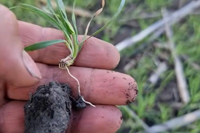 У полі, яке він продемонстрував, пшеницю посіяли із використанням розкидача міндобрив із послідуючим загортанням шляхом мілкого дискування. Втім, через опади, частину насіння господарство не встигло загорнути. Очевидно, що зароблена в ґрунт пшениця краще вкорінилася, ніж та, яку не встигли заробити. Пшениця, що виросла з незаробленого насіння, пустила довгі корінці, утворює нові, а деякі рослини пропали. Попередником був соняшник.